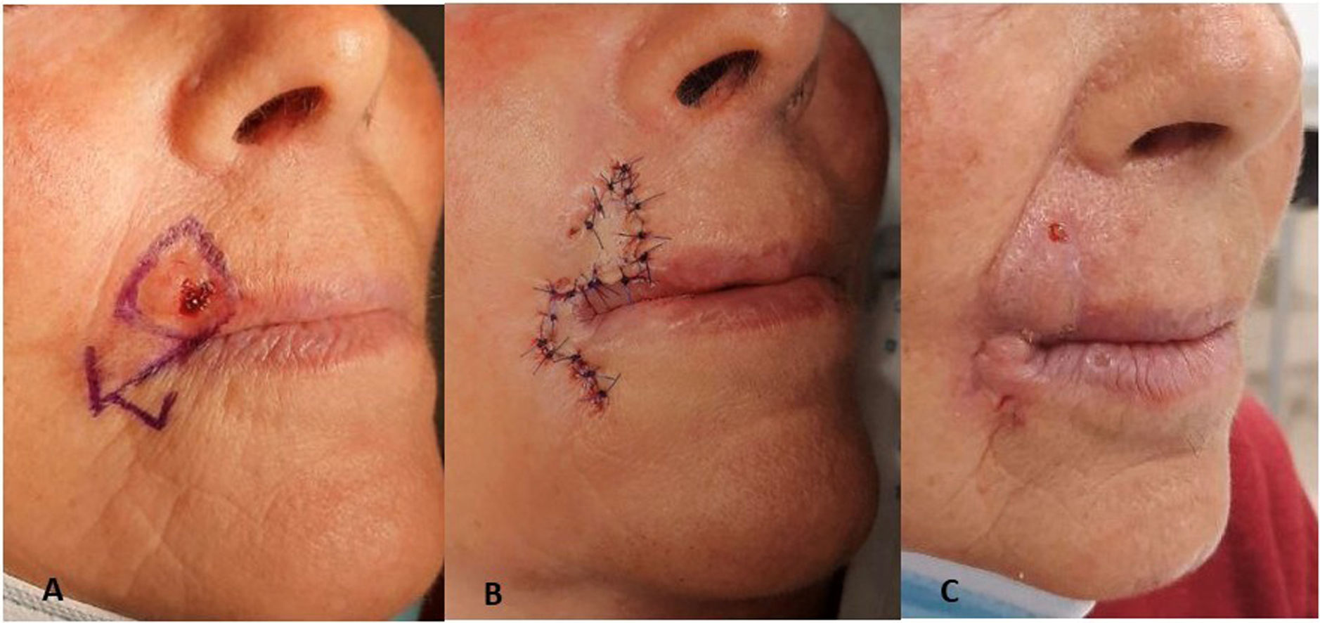 Nautilus flap used in the reconstruction of a surgical defect on the upper lip after the removal of an infiltrating basal cell carcinoma. A: Flap design turning the circular defect into a triangular one. B: Immediate postoperative, suture with prolene 4.0. C: Aesthetic result after suture removal. The morphology of the tumor requires designing the triangle with the base facing the free edge of the upper lip. However, the direction of the tension vector is the same, which is why it does not pull from the free edge. In this case, maximum tension is perpendicular to the free edge, which is right one to prevent retraction. Therefore, the resulting scar from the flap suture perfectly fits the patient's perioral region without ever distorting it.
