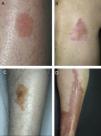 A, Extensive necrobiosis lipoidica with ulcerated areas and keratotic areas (patient 18). B, Necrobiosis lipoidica lesion that was previously ulcerated in the pretibial area and that has completely re-epithelialized (patient 16). C, Characteristic lesion of granuloma annulare in the clavicular area of patient 22. D, Disseminated granuloma annulare on the abdomen of patient 29.