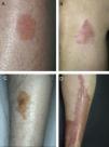 A. Necrobiosis lipoídica extensa con áreas ulceradas y áreas queratósicas (caso n.° 18). B. Lesión de NL previamente ulcerada en la región pretibial que ha reepitelizado por completo (caso n.° 16). C. Lesión típica de granuloma anular a nivel clavicular en el caso n.° 22. D. Granuloma anular diseminado en el abdomen en el caso n.° 29.