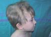 Figura 1. En zona parietotemporal derecha del cuero cabelludo se observan dos áreas, bien delimitadas, separadas por cabello normal, de pelo fino, muy rizado y rubio, con distribución blaschkoide.