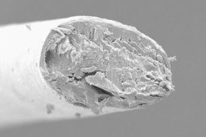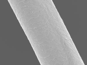 Con el microscopio electrónico de barrido (SEM) se apreció la sección transversal del tallo ovalada (fig. 3) un canal longitudinal a lo largo del tallo piloso (fig. 4) y una disminución del número de células cuticulares.