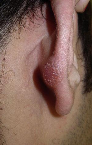 Please cite this article as: Heras-González S, Aspe-Unanue L, González-Pérez R. Nódulo en el pabellón auricular. Actas Dermosifiliogr. 2017;108:581–582.