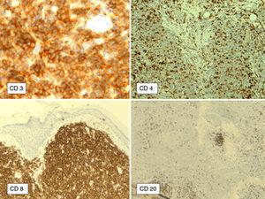 HistopathologyHematoxylin-eosin staining (Figs. 2A and B) revealed a dermal lymphoid infiltrate composed of small to medium-sized lymphocytes with little atypia, no mitotic figures, and no phenomena of avascular necrosis or epidermotropism. In addition, a grenz zone separating the lesion from the dermis—which was completely spared—was also observed. Immunohistochemical staining was clearly positive for the CD3 and CD8 markers, partially positive for CD4, and negative for CD20 and CD30 (Fig. 3).