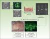Regeneración de una piel quimérica en ratones inmunodeficientes. Queratinocitos humanos normales y de un paciente con síndrome de Gorlin (marcados con GFP mediante infección con un retrovirus) fueron ensamblados en equivalentes cutáneos bioingenierizados y trasplantados a ratones inmunodeficientes. La piel regenerada (paneles inferiores) muestra la presencia de zonas fluorescentes debidas a los queratinocitos Gorlin y no fluorescentes debidas a la regeneración de piel a expensas de los queratinocitos normales.