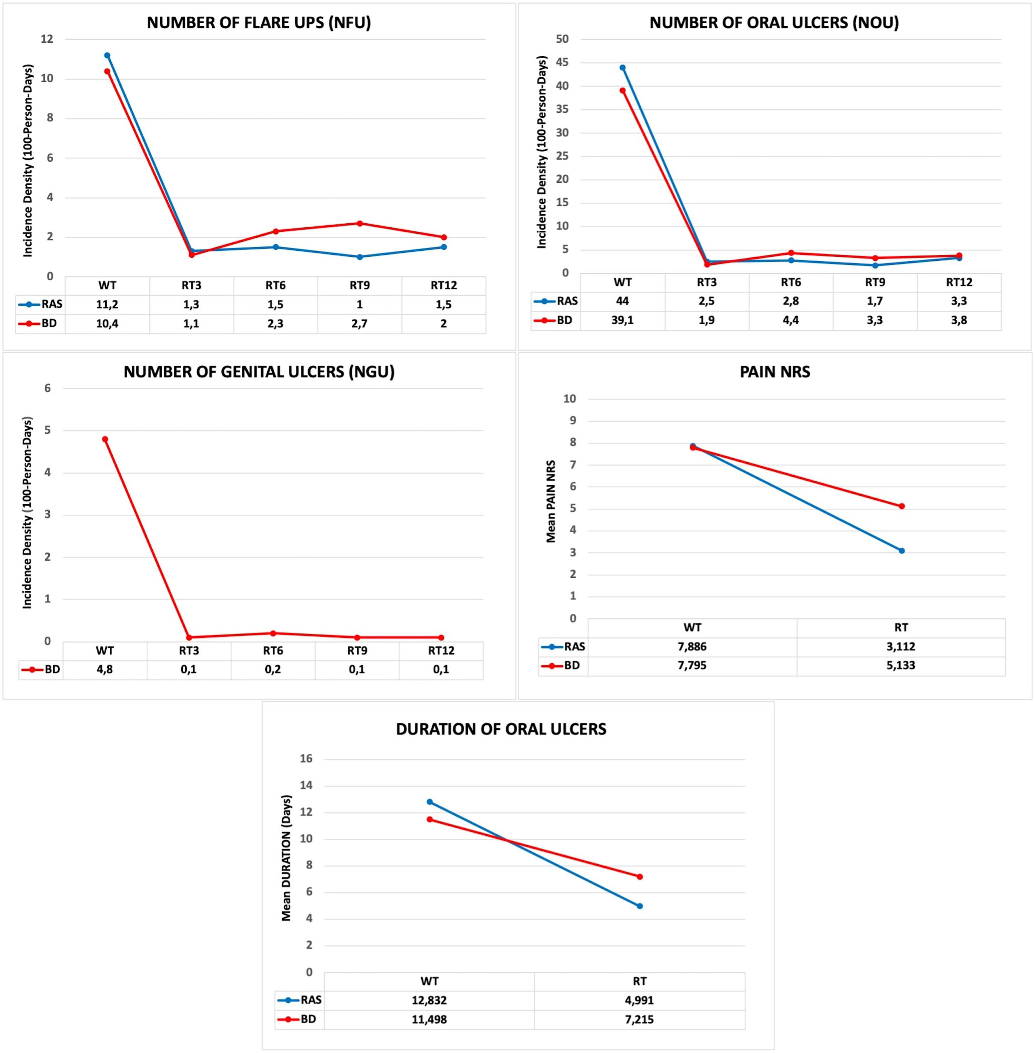 Incidence density of number of flare-ups (NFU), number of oral ulcers (NOU) and number of genital ulcers (NGU) according to each treatment period. Mean pain-NRS and duration of ulcers (DU) comparing the untreated period with the 52-week regimen of roflumilast. BD: Behçet disease; RAS: recurrent aphthous stomatitis; RT: roflumilast treatment: RT3 (0–3 months); RT6 (3–6 months); RT9 (6–9 months); RT12 (9–12 months).