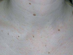 Mujer de 21 años de edad, sin antecedentes personales de interés, que consultó por la aparición progresiva en los últimos 10 años de unas lesiones asintomáticas en el cuello y la zona central del tórax. No refería antecedentes patológicos personales ni familiares de interés y no tomaba ningún medicamento.