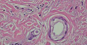 Se realizó una exéresis biopsia con sacabocados de una pápula (fig. 2).