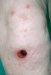 Fig. 2.--Pápulas edematosas con centro erosionado junto a una lesión en fase costrosa de mayor tamaño.