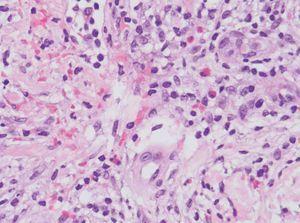 En la analítica destacaba la presencia de 36.800 leucocitos/mm 3 con 81 % de linfocitos; la bioquímica y la coagulación eran normales. Se realizó una biopsia cutánea de una ampolla (fig. 3) y de una pápula edematosa (fig. 4).