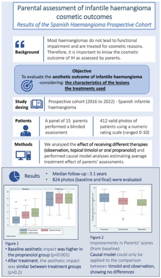 ConclusionsThis is the first large prospective cohort ever conducted to analyze the aesthetic impact of IH by a panel of parents. At baseline and due to the characteristics of IHs, the evaluation was worse in the groups of pharmacological treatment (oral propranolol and topical timolol) vs observation. These differences disappear after completion of follow-up, with around 40% achieving a result considered excellent from an aesthetic point of view. The study did not confirm that patients on timolol have better outcomes vs observation.