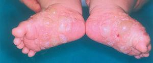 Una niña de 3 meses de edad, con buen desarrollo pondoestatural, sin incidencias en el periodo gestacional y sin antecedentes familiares ni personales de interés, fue traída a nuestra consulta tras la aparición de lesiones cutáneas de una semana de evolución. Se trataba de ampollas tensas y confluentes localizadas en palmas y plantas. En la anamnesis, el único antecedente de interés era la administración de la primera dosis de la vacuna contra la hepatitis B, poliomielitis, DTP (difteria, tétanos y tos ferina) y Haemophilus influenzae, 2 semanas antes de la aparición de las lesiones. Se inició tratamiento con agua sulfatada, dexametasona (0,3 mg/kg/día por vía intramuscular) y ácido fusídico con lo que progresivamente fueron atenuándose las ampollas hasta desaparecer a las 2 semanas. Un mes más tarde, estando las lesiones en fase descamativa, reapareció el cuadro de forma similar pero con una localización más amplia en palmas, plantas, cabeza y extremidades (figs. 1 y 2). Tres días antes, la paciente había recibido la segunda dosis de la vacuna hexavalente. La niña permaneció en todo momento afebril y con buen estado general.