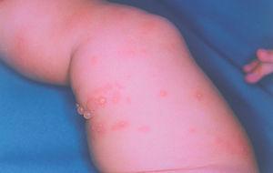 Presentamos una niña de 2 meses de edad con lesiones ampollosas aparecidas una semana después de recibir la primera dosis de la vacuna hexavalente y un mes después, a los 3 días de la segunda dosis de la misma vacuna.