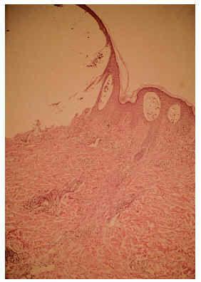Fig. 2.--Detalle de un lateral de la ampolla, con infiltrados perivasculares de eosinófilos y en el interior de la cavidad (HE, x100).