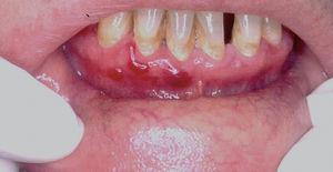 Fig. 2.--Eritema y erosiones, con ampollas rotas localizadas en la mucosa gingiva inferior (paciente 2).