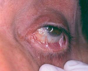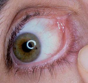 Fig. 3.--Ligera inyección conjuntival con fibrosis incipiente en mucosa conjuntival (estadio II de Foster) (paciente 2).