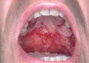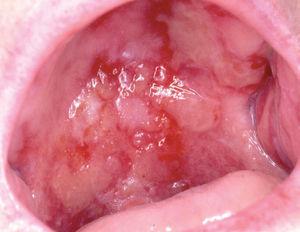 Fig. 5.--Erosiones secundarias a rotura de ampollas localizadas en todo el paladar duro y parte del paladar blando (paciente 3).
