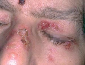 Un varón de 46 años tenía antecedentes de erosiones en mucosa oral desde hacía varios años, con dificultad para tragar. No mejoró con la administración de prednisona 30 mg/día. De manera progresiva fue empeorando y apareció enrojecimiento con dolor en ambos ojos y hemorragia nasal frecuente, erosiones en genitales y ano, y presencia de ampollas en cara y extremidades. El paciente fue diagnosticado de PM 8. Recibió diferentes tratamientos con dapsona (100 mg/día), azatioprina (100 mg/día), micofenolato mofetilo (2 g/día) y ciclosporina (4 mg/kg/día). La situación clínica del paciente fue empeorando. Cuando se valoró inicialmente al paciente presentaba enrojecimiento conjuntival con presencia de sinequias y simbléfaron (estadio III de Foster 9) (fig. 4), erosiones en la mucosa oral (fig. 5), lesiones erosivas y costrosas en cara, pabellones auriculares y extremidades (fig. 6), mucosa genital y mucosa anal (fig. 7). El paciente continuó con la misma dosis de prednisona (30 mg/día) y se inició la administración de bolos de ciclofosfamida (inicialmente 750 mg/m 2, aumentando a 1 g/m 2), recibiendo 8 sesiones, cada una mensualmente. A este tratamiento se añadió dapsona 100 mg/día (G6PD dentro de límites normales) junto a 800 mg/día de vitamina E. La situación clínica del paciente fue mejorando de manera progresiva y desapareció la inyección conjuntival, las lesiones cutáneas y las erosiones de mucosa oral, anal y genital. Al terminar el último bolo de ciclofosfamida el paciente estaba con 7,5 mg/día de prednisona, continuando con la misma dosis de dapsona. Dos años después de terminar el tratamiento con ciclofosfamida no presentó nuevas lesiones activas.