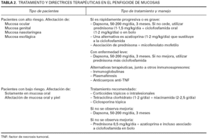 El tratamiento depende de la localización de las lesiones y de las secuelas que se presenten. Varios autores establecieron las pautas a seguir en este grupo de pacientes 33,34 (tabla 2). Durante el primer Simposio internacional de consenso sobre penfigoide de membranas mucosas, varios autores establecieron que el riesgo de morbilidad en la enfermedad es bajo cuando existen únicamente lesiones en la mucosa oral, o asociado a lesiones en la piel. En estos casos es de gran importancia la higiene oral. Se recomiendan también productos como agua oxigenada asociados a difenhidramina y dexametasona 35, anestésicos locales con difenhidramina 1, corticoides tópicos o intralesionales 36,37 o también la administración de tetraciclinas clorhidrato junto a nicotinamida 38,39, o ciclosporina tópica 40. Cuando además de la mucosa oral existe también afectación de la piel, o cuando los pacientes no mejoran con los tratamientos anteriores suele utilizarse dapsona entre 50-200 mg/día 6,41, y muchas veces es necesaria la administración de prednisona junto a azatioprina 42 o ciclofosfamida 33, principalmente en forma de bolos ya que, de esta manera, los efectos secundarios son menores.
