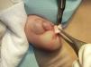Various surgical techniques can be used to resect these tumors, depending on whether they arise from above or below the nail plate. Lesions beneath the nail plate require partial or total removal of the nail. Lesions above the nail plate, on the other hand, can be removed by shaving followed by phenolization,3 carbon-dioxide laser vaporization,4 or, more usually, surgical resection after lifting the proximal nail fold as a banner flap.5