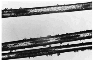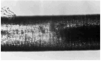 Al microscopio óptico el pelo mostraba las características bandas oscuras anormales (fig. 1), que se correspondían con las regiones brillantes vistas con la luz incidente, distribuidas de forma intermitente, produciendo una apariencia anillada (fig. 2).