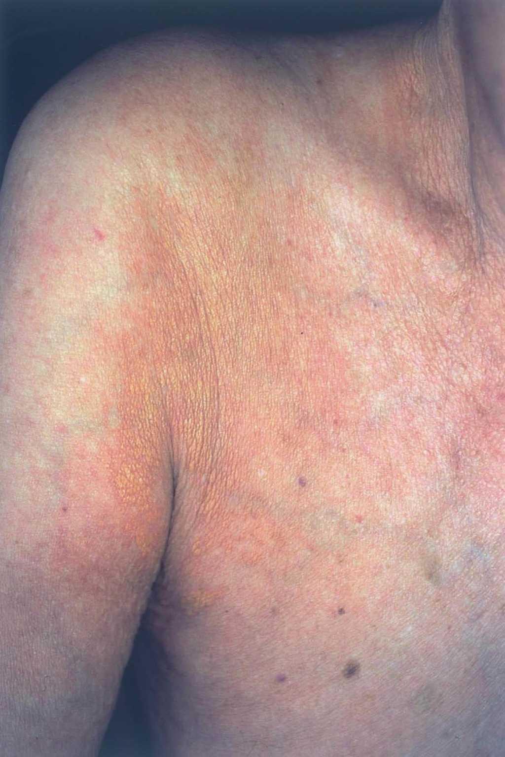 Acudió a nuestra consulta por la aparición progresiva desde hacía 3 meses de lesiones amarillentas, asintomáticas, en el tronco.