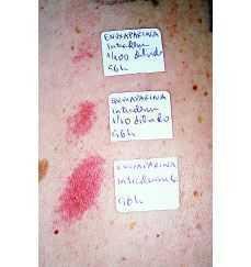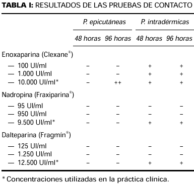 Se realizaron 15 controles con pruebas epicutáneas con enoxaparina sódica tal cual y cinco con pruebas intradérmicas con enoxaparina, dalteparina y nadroparina a concentraciones utilizadas en la práctica clínica. La lectura a las 48 y 96 horas fue negativa en todos los casos.