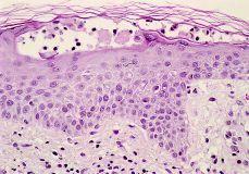 La placas eritematosas por HBPM subcutánea en nuestro paciente están probablemente mediadas al menos por un mecanismo de hipersensibilidad tipo IV, hecho apoyado fundamentalmente por los resultado positivos a las 48 y 96 horas de las pruebas de contacto y por la negatividad de las pruebas realizadas en los controles. Se ha demostrado un aumento de queratinocitos expresando HLA-DR en estudios inmunohistoquímicos y un número elevado de linfocitos T CD4 (1, 15). Debido a la naturaleza química de la heparina se ha sugerido que una reacción de hipersensibilidad tipo IV sólo puede explicarse si la heparina se une previamente a estructuras proteícas dérmicas o subcutáneas (1, 15). Todavía no se ha determinado la porción antigénica de la heparina (13, 17). En general, las lesiones secundarias a HBPM aparecen en los lugares de inyección tras semanas o incluso meses de tratamiento (1). En nuestra paciente las lesiones aparecen 7 días después de comenzar el tratamiento con enoxaparina sódica. Tanto la duración del tratamiento como el tiempo de latencia podrían considerarse cortos en relación con un mecanismo de hipersensibilidad retardada si no tenemos en cuenta la posibilidad de una sensibilización previa de la paciente a dicha