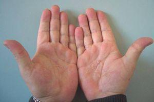 Nuestro paciente, un varón de 56 años, acudió a la consulta por presentar placas hiperqueratósicas pruriginosas, que afectaban de forma simétrica a palmas y plantas, de 3 semanas de evolución. El paciente había presentado 7 años antes placas eritematodescamativas en tronco.