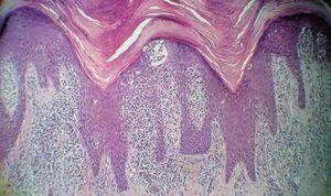 Se realizó un punch biopsia de un borde de la placa de la palma izquierda (figs. 3 y 4).