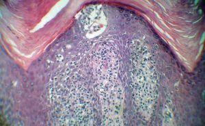 El examen histopatológico mostraba una hiperplasia epidérmica psoriasiforme, con un infiltrado en dermis de linfocitos grandes atípicos de núcleo convoluto con figuras de mitosis, exocitosis de linfocitos y exocitosis de linfocitos con formación de abscesos. El estudio inmunohistoquímico mostró positividad para CD3, CD4 y CD8 y fue negativo para CD30.