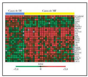 Fig. 2.--Imagen del microchip de ADN-c que muestra los 27 genes significativos en la separación de casos de micosis fungoide (MF) y casos de dermatosis inflamatorias (DI) (29 muestras de MF, 11 muestras de DI). Véase la casi perfecta separación de la imagen en cuatro cuadrantes. En rojo se representan los genes sobreexpresados. El cuadrante superior izquierdo muestra los 7 genes sobreexpresados en las muestras de DI. En el cuadrante inferior derecho, los 20 genes sobreexpresados en las muestras de MF.