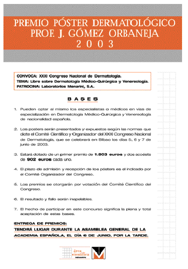La Junta Directiva de la Academia Española de Dermatología y Venereología, en su reunión del 25 de febrero de 2003, tomó el acuerdo de convocar los siguientes premios, cuyos patrocinadores y condiciones específicas y comunes se exponen a continuación: