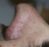 Our patient was a 44-year-old man with no past history of interest. He was seen for a nodular lesion that had appeared on the left nasal ala 3 weeks earlier and had grown progressively. At the time of consultation, this well-defined, indurated nodular lesion measured 2.5cm in diameter and there were no changes in the overlying skin (Fig. 1). No other cutaneous lesions were observed and there were no palpable lymph nodes or organomegaly.