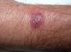 A 53-year-old male livestock worker with psoriatic arthritis, for which he had been treated with leflunomide (5 years) and certolizumab (2 years), presented with an asymptomatic lesion on the wrist that had appeared 15 days earlier and had not responded to a 1-week course of oral clarithromycin (500mg/12 h) and topical fusidic acid therapy. The patient reported neither fever nor systemic symptoms. Physical examination revealed an indurated, erythematous-violaceous nodule (2cm in diameter) with a central crust on the dorsum of the left wrist (Fig. 1). A swab sample was collected from the lesion surface for culture and a skin biopsy was taken for culture and histopathology.
