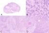 The macroscopic study revealed a 3cm × 1.5cm × 1cm lesion—light brown in color and of a multinodular morphology—with two 0.7cm and 0.5cm whitish regions of stony consistency.