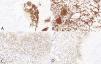 Histologically, an epithelial proliferation corresponding to a moderately differentiated squamous cell carcinoma with presence of keratin whorls and keratin pearls was identified, without regions of normal epidermis (fig. 1). This region showed a squamous immunophenotype with positivity for p40, p63, CK AE1/AE3, and CK 5/6, while SATB2 (fig. 2), actin, and desmin tested negative; vimentin tested positive in the osteoblastic component and negative in the squamous one.