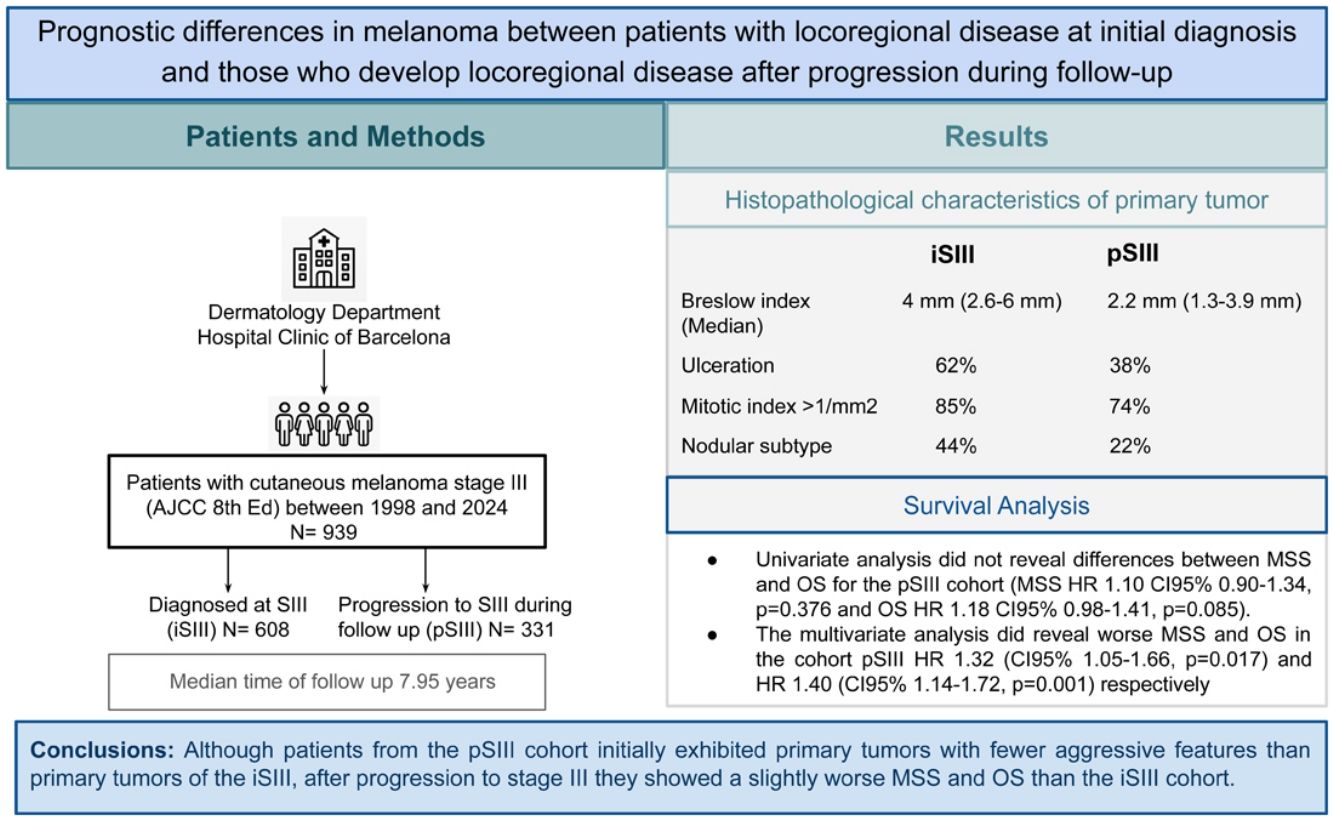 Materials and methodWe conducted a cohort study with patients diagnosed with cutaneous melanoma between 1998 and 2022. Patients in stage III (AJCC 8th) were identified and divided into 2 cohorts: initial stages IIIB-D (iSIII) and stages IIIB-D during progression (pSIII). We analyzed the clinical and histopathological characteristics and performed Cox regression analysis for melanoma specific survival (MSS) and overall survival (OS).