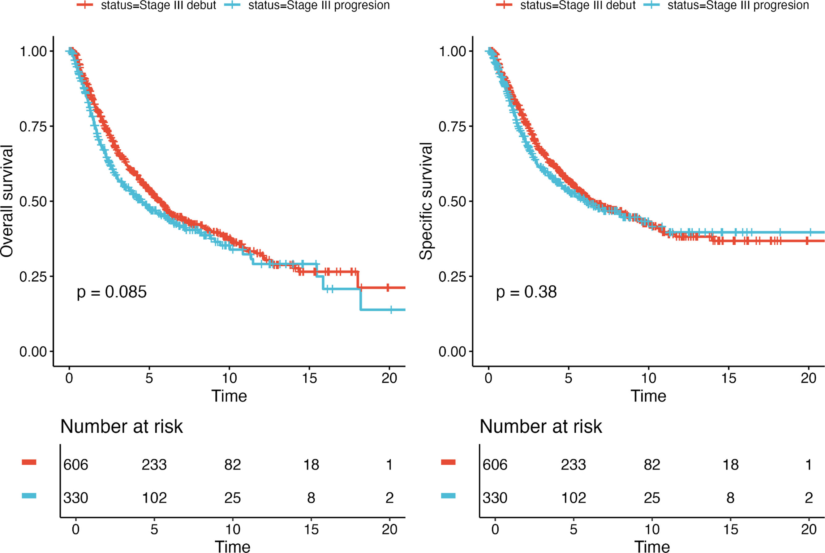 ConclusionsAlthough patients from the pSIII cohort initially exhibited primary tumors with fewer aggressive features than primary tumors of the iSIII, after progression to stage III they showed a slightly worse MSS and OS than the iSIII cohort.