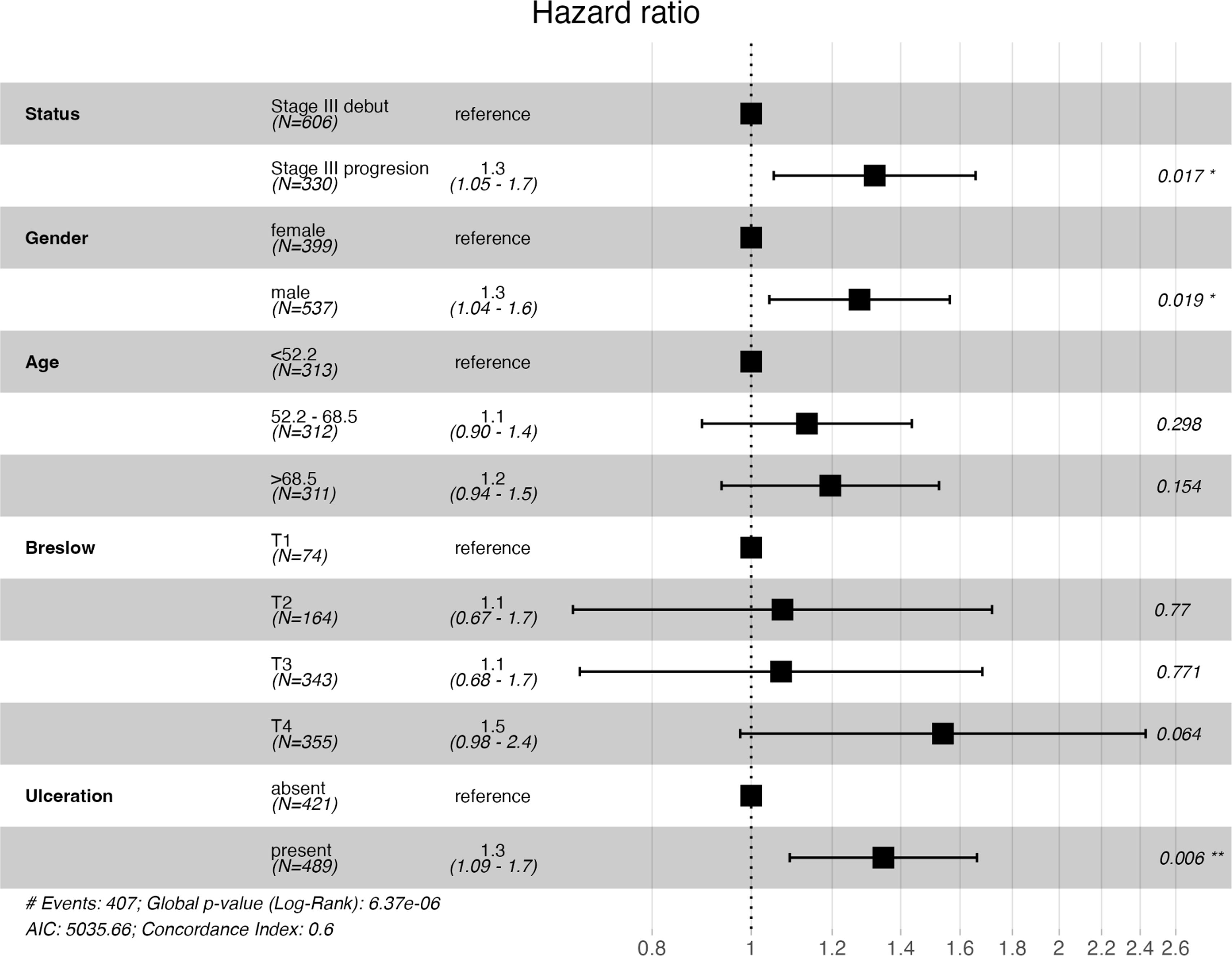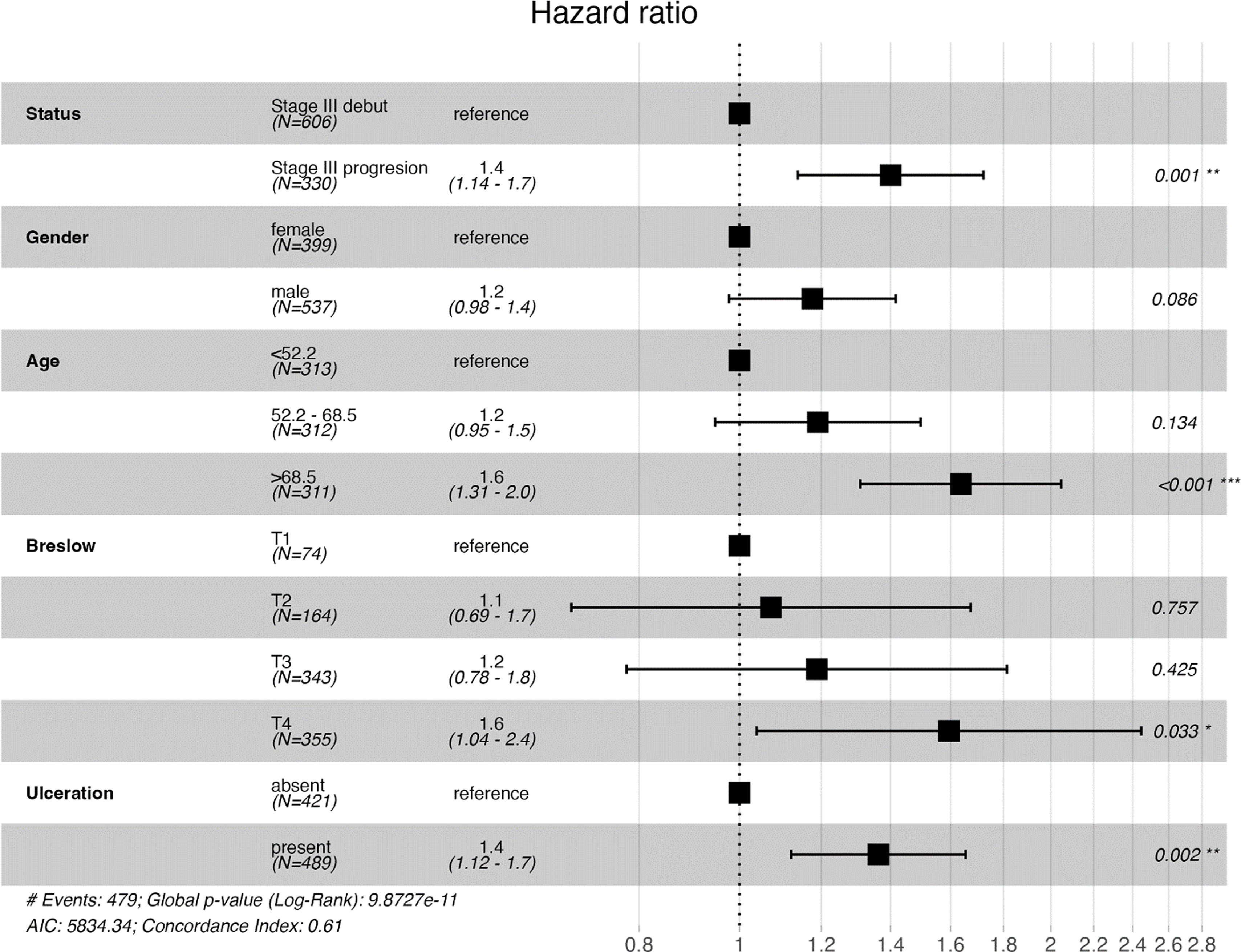 ResultsOf the 939 patients included, 608 had incident stage III (iSIII) melanoma and 331 had progressive stage III (pSIII) melanoma. Primary melanomas in the iSIII cohort showed greater Breslow thickness and higher mitotic indices and were more frequently ulcerated than those in the pSIII group (p<.001). Multivariable Cox regression analysis showed a slightly worse MSS and OS for patients in the pSIII cohort with an HR of 1.32 (95%CI, 1.05–1.66; p=0.017) and an HR of 1.40 (95%CI, 1.14–1.72; p=0.001) respectively.