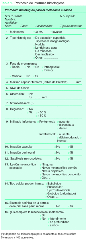 Es posible que en un futuro, a medio o largo plazo, el uso de técnicas de biología molecular ayude a precisar el comportamiento biológico de un determinado tumor y permita una mayor individualización del tratamiento de cada paciente con melanoma. Sin embargo, la actual coyuntura asistencial dista mucho de alcanzar esos objetivos. Por ello, parece necesario mantener la recogida de datos histológicos obtenidos tras el procesamiento habitual de la pieza tumoral en parafina y la tinción con hematoxilina y eosina. Aunque existen múltiples protocolos histológicos y la mayoría de ellos incluyen variables más o menos similares, no existe unanimidad en todos ellos en la forma en que deben ser recogidas todas las variables. En este artículo se pretende proponer un protocolo para la recogida de variables histológicas del tumor primario y definir cada una de ellas de acuerdo con los criterios más precisos y reproducibles que se hayan utilizado hasta la fecha.