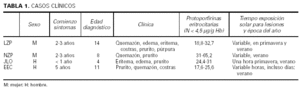 El último paciente era un niño de 11 años que desde que tenía 5 ocasionalmente comentaba tener prurito, escozor y quemazón intensos en manos y región supralabial tras exposición solar en época de verano. A veces ocurría durante los primeros días de verano en los que iba a la playa y otras veces ocurría a los 3 ó 4 días. La madre comentó haber apreciado alguna pequeña lesión costrosa inespecífica en dorso de nariz y orejas. Las protoporfirinas eritrocitarias al diagnóstico eran de 17,6 µg/g de hemoglobina.