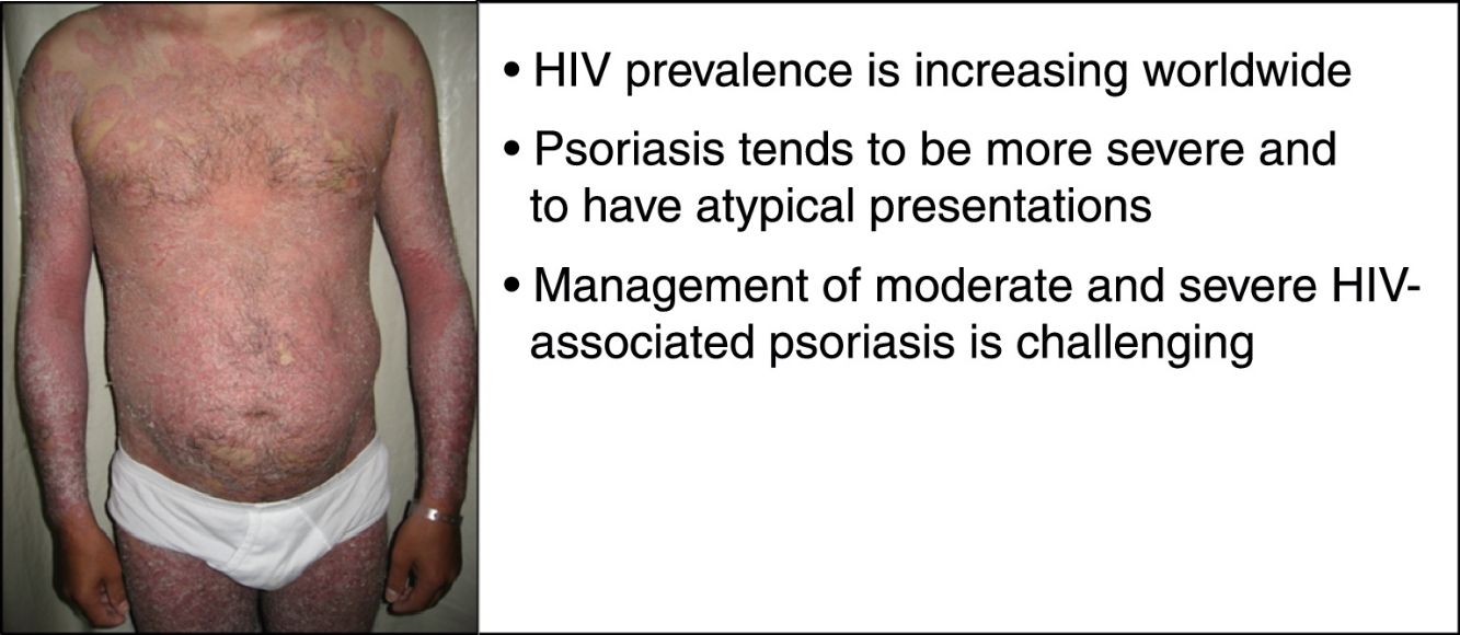Human immunodeficiency virus (HIV) prevalence is increasing worldwide as people on antiretroviral therapy are living longer. These patients are often susceptible to debilitating inflammatory disorders that are frequently refractory to standard treatment. Psoriasis is a systemic inflammatory disorder, associated with both physical and psychological burden, and can be the presenting feature of HIV infection. In this population, psoriasis tends to be more severe, to have atypical presentations and higher failure rates with the usual prescribed treatments.