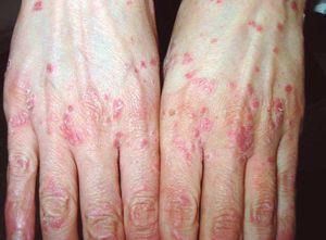 Figura 2. Erupción eritemato-descamativa en manos.