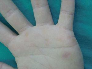 Fig. 2.--Lesiones papulosas amarillentas en las palmas de las manos.