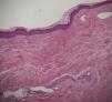 Histopathology (HE ×10): thickened collagen bundles in dermis, closely packed. Epidermal atrophy. Discrete perivascular limphocytic infiltrate.