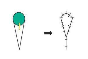 5.Colgajo en hacha vertical. Es un colgajo por rotación que puede emplearse para pequeños defectos de la punta nasal. Se diseca el defecto en forma circular o elíptica y se diseña un colgajo en la zona superior en forma de «hacha» que se desplaza hacia abajo para cubrir el defecto (fig. 29).