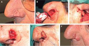 Figura 8. Carcinoma basocelular en ala nasal. Solución del defecto quirúrgico con interposición de cartílago e injerto cutáneo tomados de anthélix. A. Aspecto del tumor. B. Defecto quirúrgico tras la extirpación. C. Cierre en estrella de la zona dadora del anthélix. D. Interposición y sutura a la base del defecto de un triángulo de cartílago. E. Sutura del injerto. F. Resultado estético a los dos meses de la intervención.