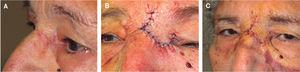 Figura 16. Carcinoma basocelular de raíz nasal. Solución del defecto quirúrgico con un colgajo glabelar de rotación. A. Aspecto inicial del tumor. B. Realización del colgajo. C. Aspecto al retirar puntos de sutura.