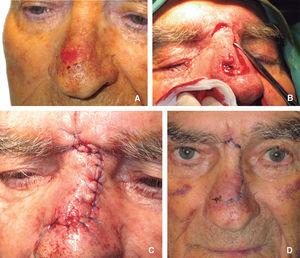 Figura 20. Carcinoma apocrino extirpado en dorso nasal. A. Aspecto inicial del tumor. B y C. Realización del colgajo de Riegler. D. Aspecto al retirar la mitad de los puntos de sutura.