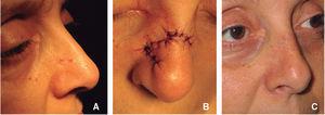 Figura 22. A. Tricoblastoma en dorso nasal. B. Cierre del defecto con un colgajo melolabial. Aspecto al retirar puntos. C. Aspecto a los 2 meses de la intervención.